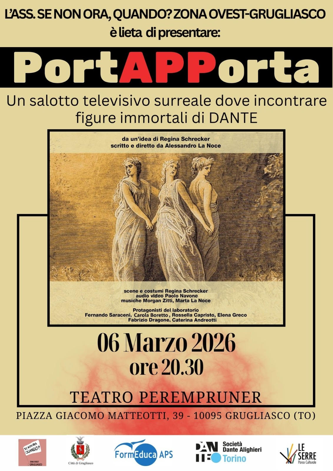 L'Associazione Se Non Ora Quando? - Zona Ovest Grugliasco presenta PortAPPorta, un salotto televisivo surreale dove incontrare figure immortali di Dante.