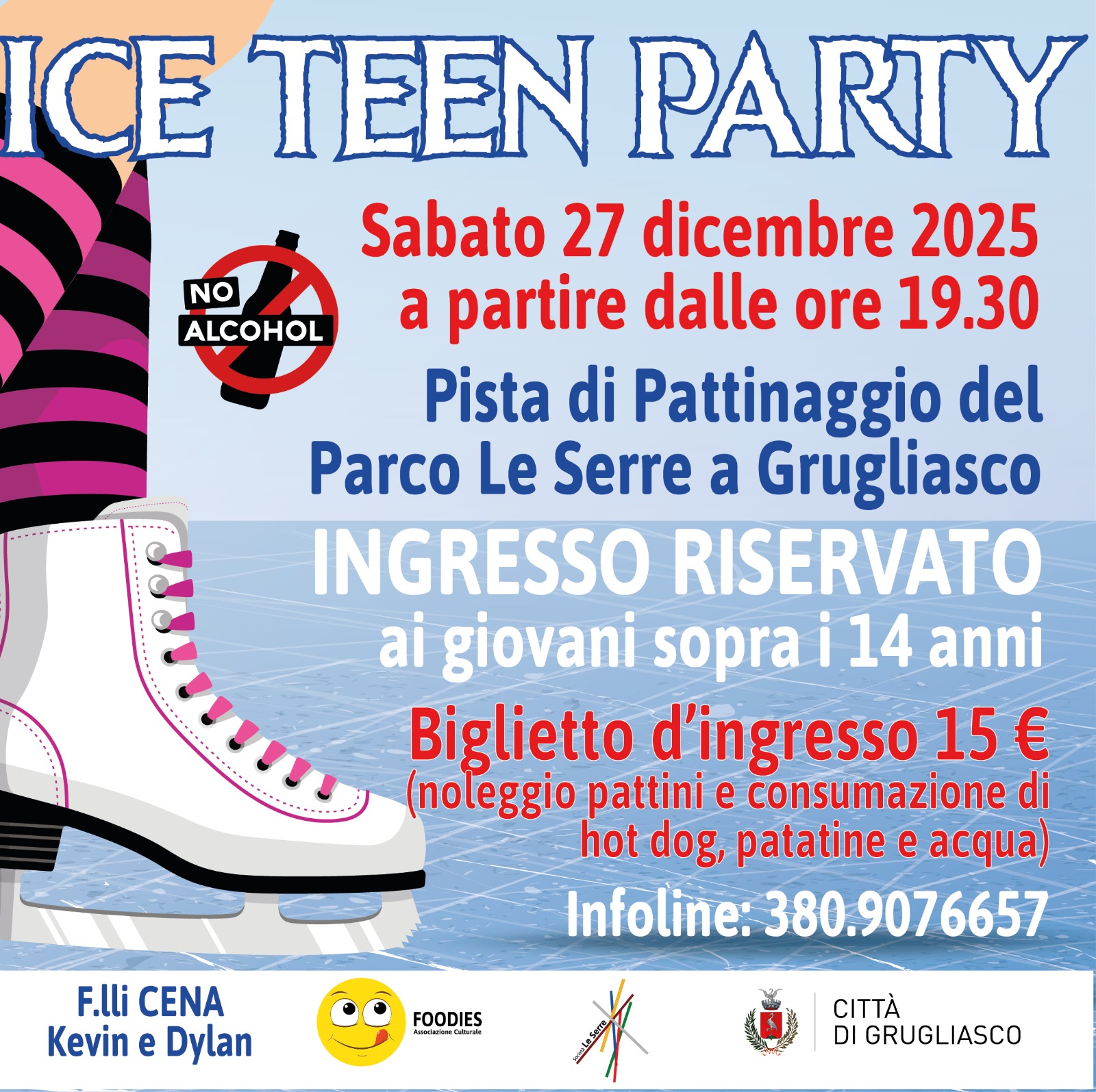 Ice teen party, è in programma sabato 27 dicembre, dalle 19.30. La serata, riservata ai giovani sopra i 14 anni, prevede un biglietto d’ingresso a 15 euro comprensivo di noleggio pattini, acqua, hot dog e patatine