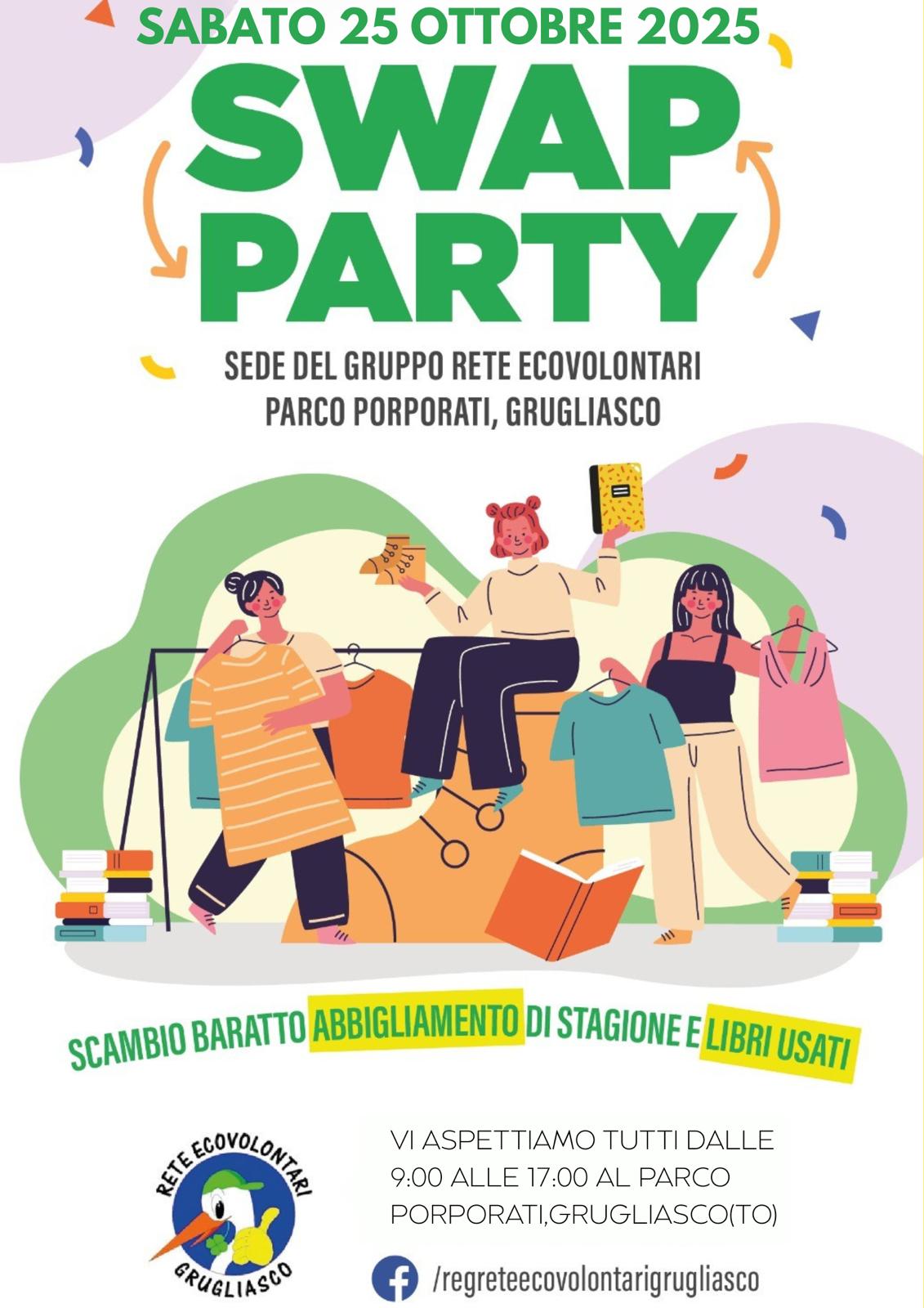 L'Associazione Ecovolontari di Grugliasco organizza, con il patrocinio del Comune, lo Swap Party per sabato 25 ottobre dalle 9 alle 17 presso la propria sede all'interno del parco Porporati.