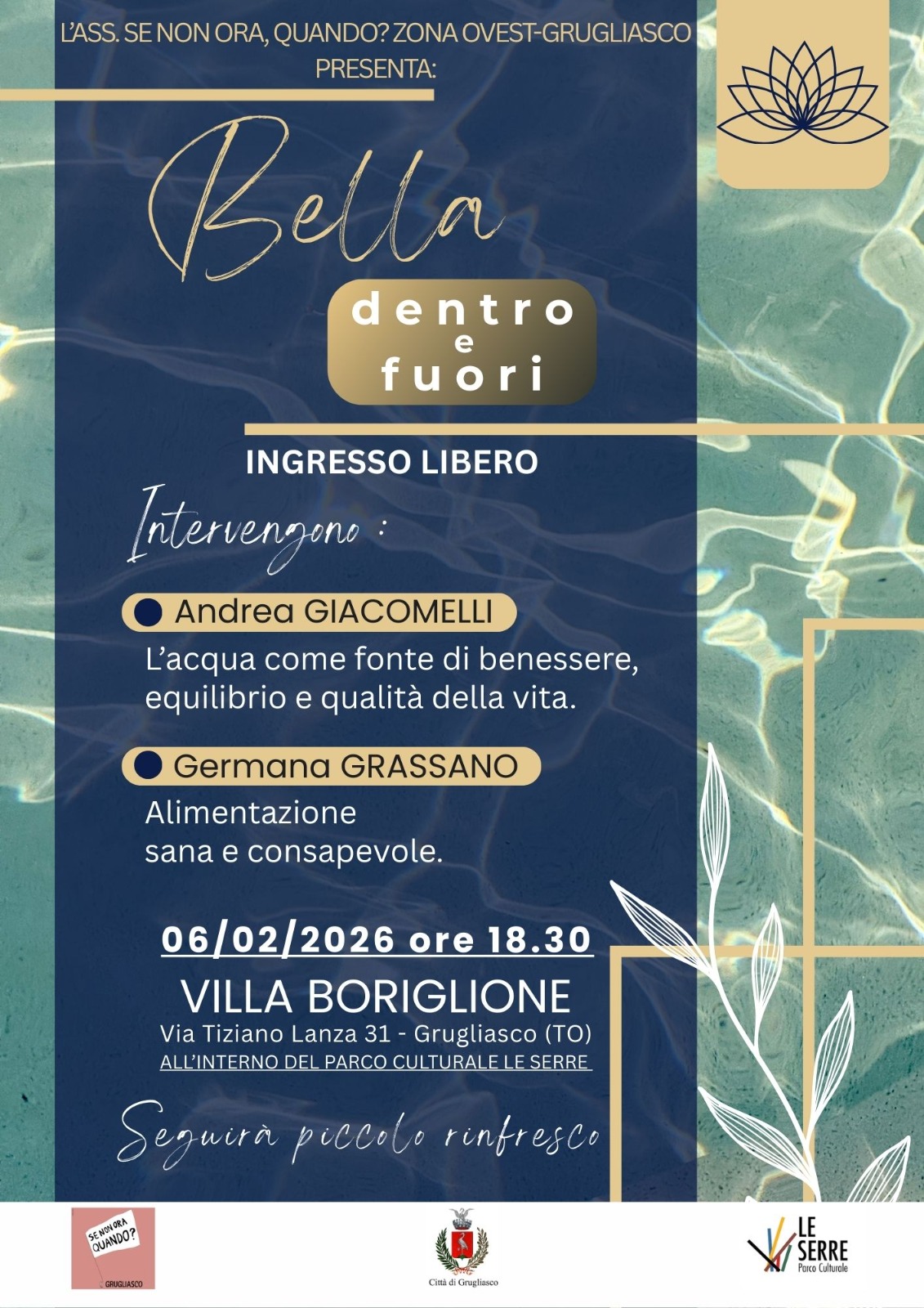 Venerdì 6 febbraio alle ore 18.30 si svolgerà l’evento “Bella dentro e fuori”, nella splendida cornice di Villa Boriglione all’interno del Parco Culturale Le Serre, realizzata dall’Associazione Se Non Ora, Quando? di Grugliasco.