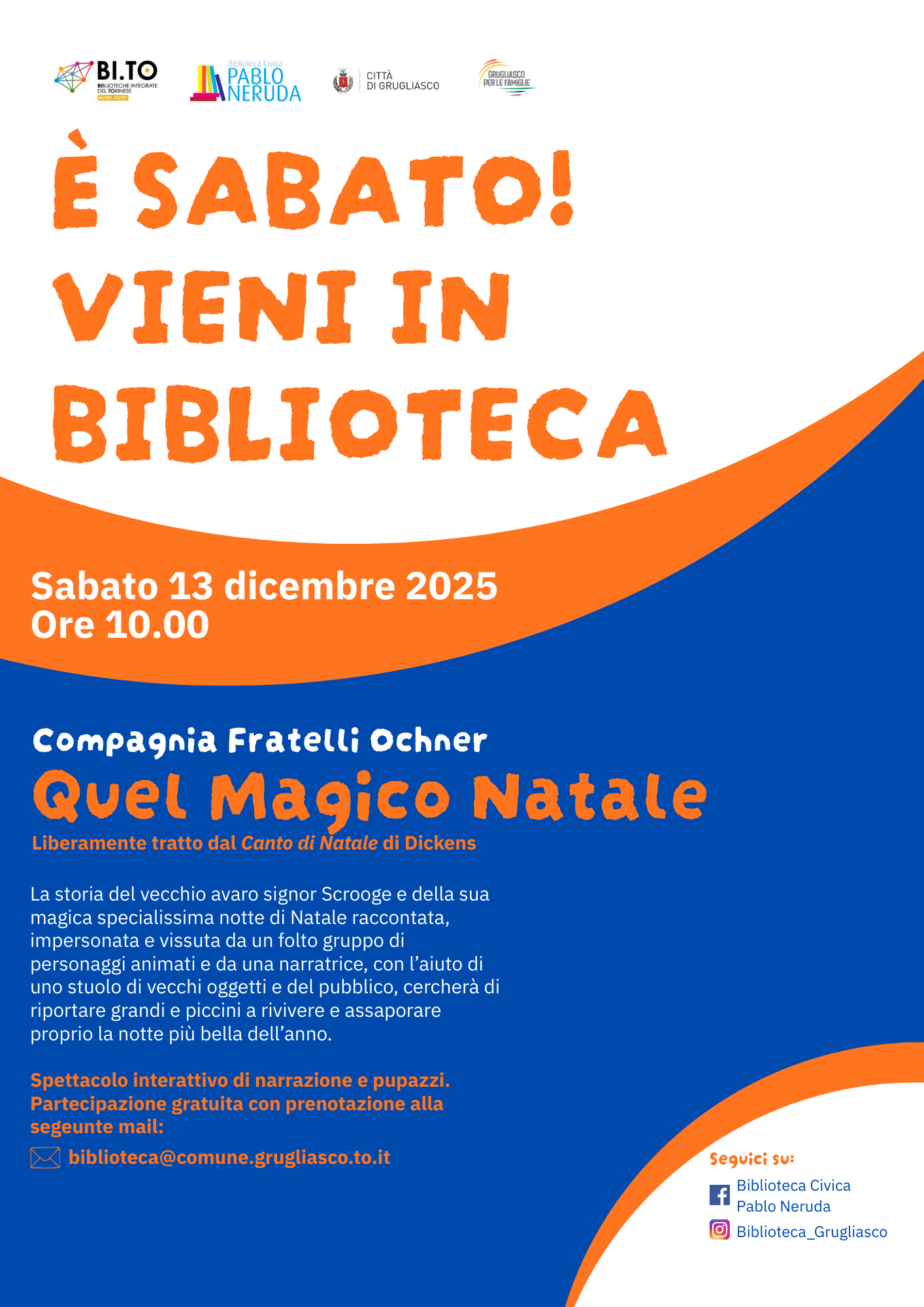 Quel Magico Natale: si intitola così lo spettacolo interattivo di narrazione e pupazzi, liberamente tratto dal Canto di Natale di Dickens, che si terrà sabato 13 dicembre alle 10 presso la biblioteca civica Pablo Neruda in piazza Matteotti 39. A portarlo in scena la Compagnia Fratelli Ochner.