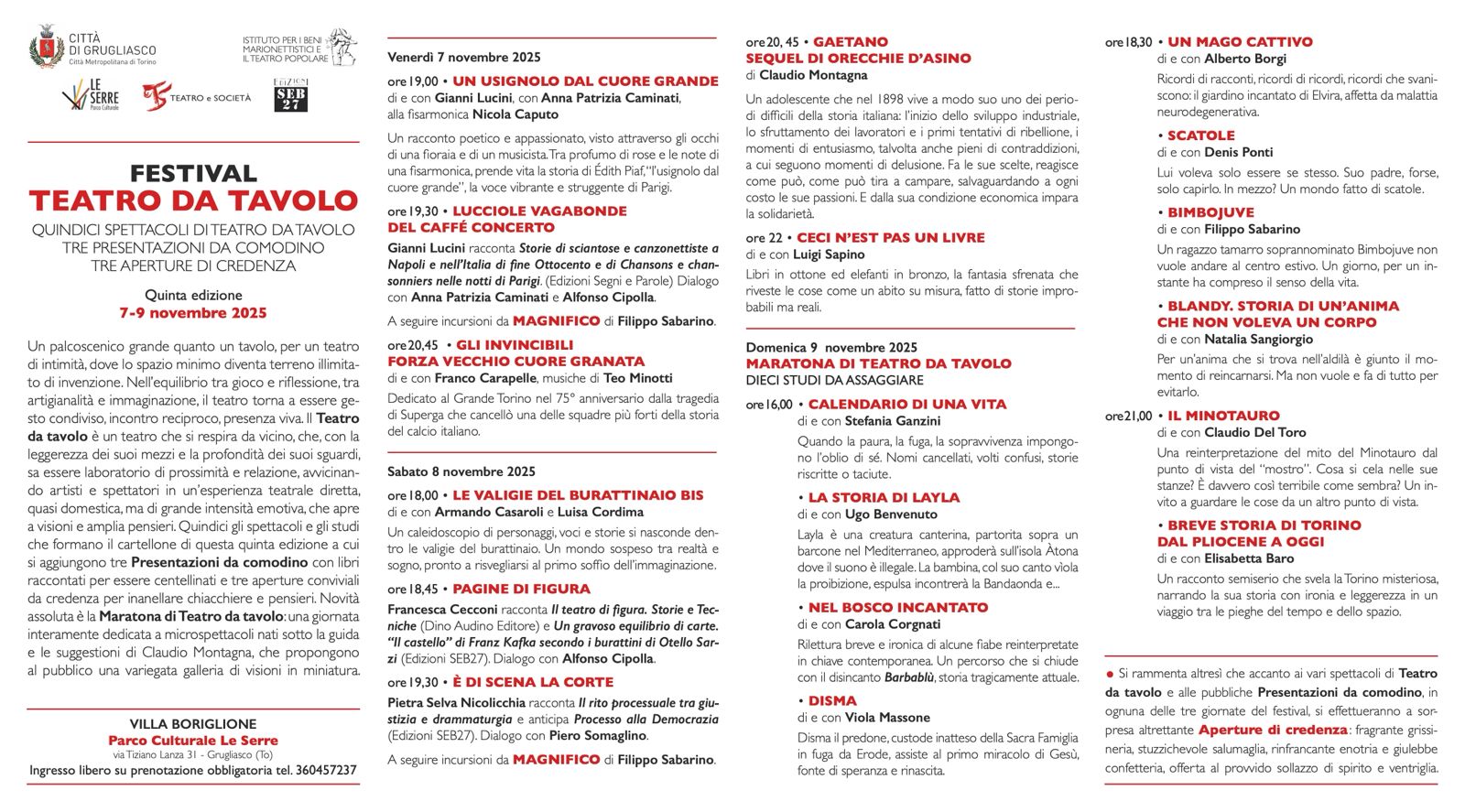 Torna a Grugliasco, dal 7 al 9 novembre 2025, il Festival di Teatro da Tavolo, una delle esperienze teatrali più originali del panorama nazionale giunta quest’anno alla sua quinta edizione. Nato da un’idea dell’Istituto per i Beni Marionettistici e il Teatro Popolare in collaborazione con Teatro e Società e ospitato nel suggestivo scenario del Parco Culturale Le Serre, il Festival di Teatro da Tavolo rappresenta un appuntamento unico: un “distillato” dei tanti linguaggi della scena contemporanea che, ridotti all’essenziale, trovano sul tavolo la loro piena espressione.