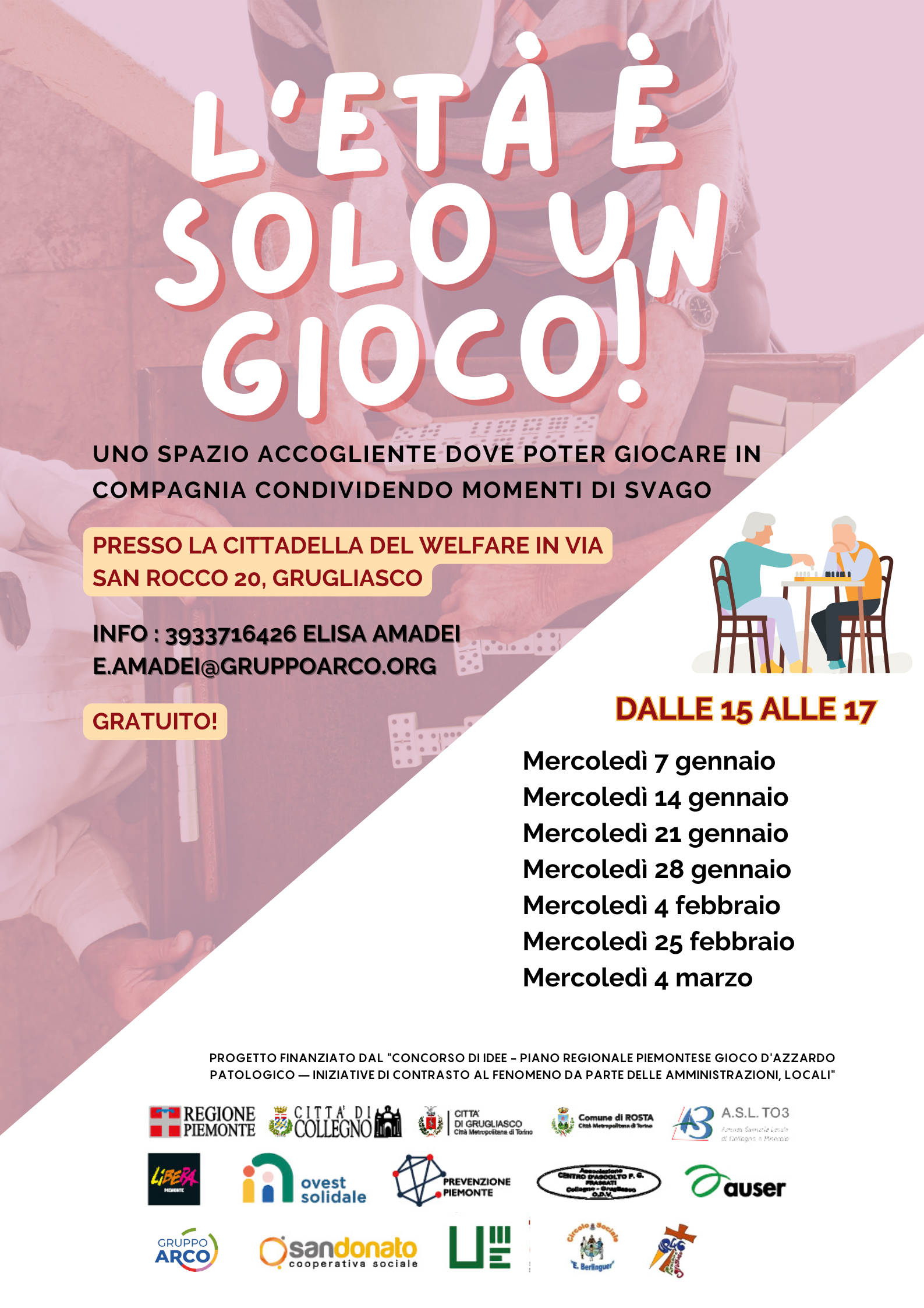 Riparte da gennaio l'Età è solo un gioco!, uno spazio accogliente dove poter giocare in compagnia condivendo momenti di svago, presso la Cittadella del Welfare in via San Rocco 20.