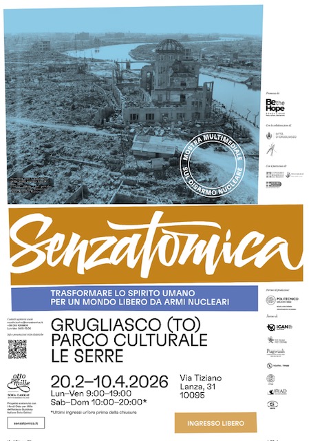 La simulazione del lancio di una bomba atomica su Torino, una visita immersiva nei luoghi della memoria di Hiroshima e Nagasaki attraverso un visore e le esperienze degli hibakusha, i sopravvissuti allo scoppio delle bombe atomiche: tutto questo in una versione totalmente rinnovata e rivista dal punto di vista contenutistico, grafico ed espositivo. Senzatomica. Trasformare lo spirito umano per un mondo libero da armi nucleari” inaugura il 20 febbraio 2026 alle ore 17:30. L’esposizione si svolgerà presso il salone La Nave del Parco Culturale Le Serre – via Tiziano Lanza 31, Grugliasco (TO) fino al 10 aprile e sarà aperta dal lunedì al venerdì dalle 9:00 alle 19:00 e il sabato e la domenica dalle 10:00 alle 20:00 (ultimi ingressi un’ora prima della chiusura).