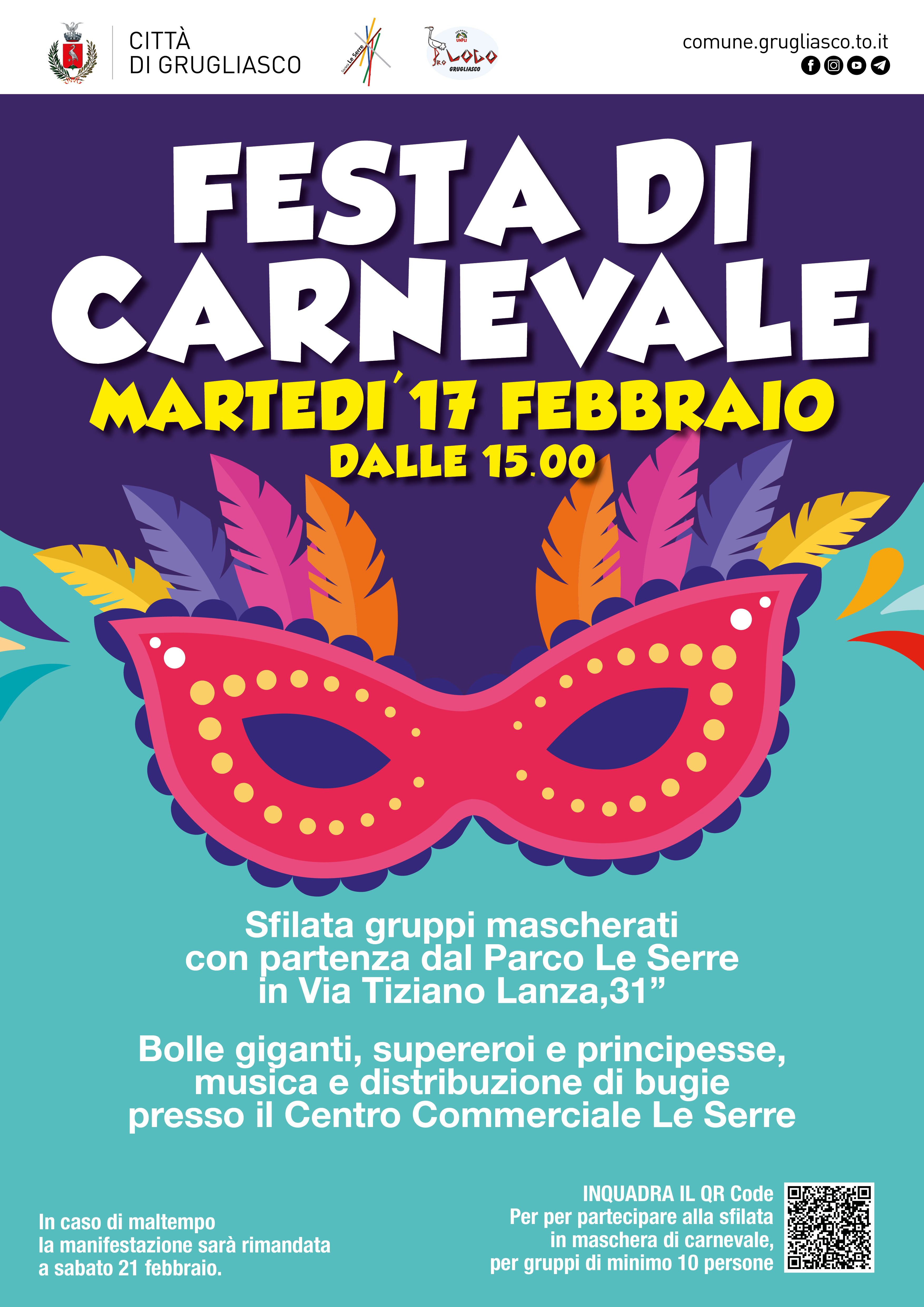Un pomeriggio di festa, colori e creatività aperto a gruppi mascherati pronti a divertirsi insieme! L'appuntamento è per martedì 17 febbraio alle 15, con partenza dal parco Le Serre