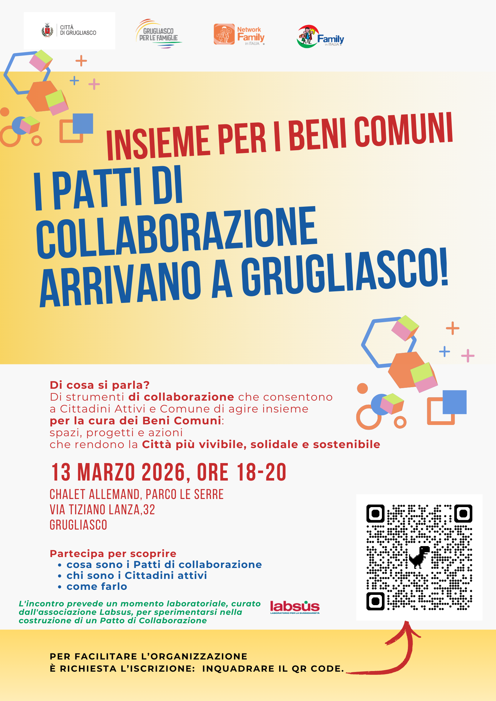 La serata preverde un momento laboratoriale, curato in collaborazione con l'Associazione Labsus, per sperimentare la costruzione di un Patto di Collaborazione. Ai fini organizzativi, se volete partecipare, vi chiediamo di iscrivervi al link: https://forms.gle/GhhHrTb3MVFvpLto6
